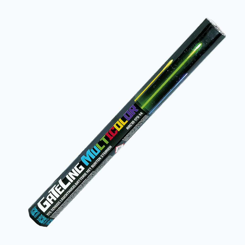 n n175-schots flare batterij met kleurrijke sterren. Verkrijgbaar in verschillende kleuren en effecten, voor gebruik in shows etc. n n Argento Vuurwerk GaTeLing Multicolor Goedkoop vuurwerk kopen bij Vuurwerkwinkel Eindhoven