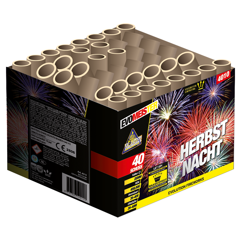 Herbstnacht, Maak u klaar voor een spectaculaire lichtshow! 40 schoten lang knalt deze absolute topper van een siercake de mooiste rode/gouden effecten de hemel in, om af te sluiten met een prachtige crackling burst! n nProductinformatie: nType product: Duits vuurwerk nEffect product: Cake nTube diameter: mix mm nFanshape: Ja nClassificatie: CAT.F2 nMinimale leeftijd: 16 jaar nLegaal afsteken op: 31 december nVeiligheidsafstand: minimaal 8 meter nGeschikt voor smalle straten: Nee nGeschikt in Gemeente vuurwerkverbod: Nee Herbstnacht 40 shots 25mm Goedkoop vuurwerk kopen bij Vuurwerkwinkel Eindhoven
