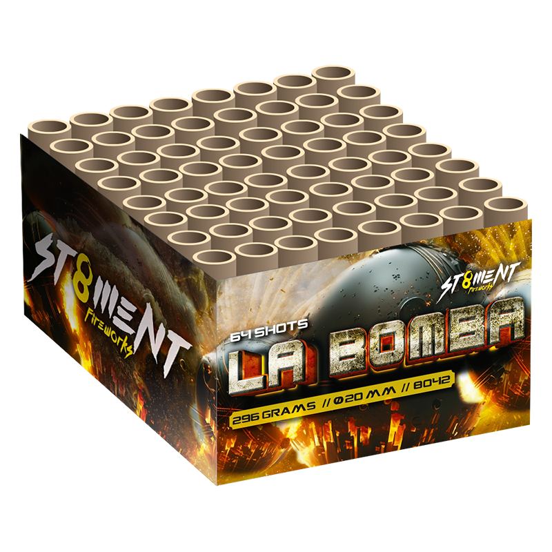 La Bomba! Knallend en fluitend het nieuwe jaar in? Dan is deze La Bomba-cake jouw perfecte keuze! Gebaseerd op de oude Estallar van St8ment schiet deze cake 64 schoten in heftige salvos van siervuurwerk en fluit in een hoog tempo de hemel in! Topper van de bovenste plank! n nProductinformatie: nType product: Siervuurwerk nEffect product: Cake nTube diameter: 20mm nFanshape: Nee nClassificatie: CAT.F2 nMinimale leeftijd: 16 jaar nLegaal afsteken op: 31 december nVeiligheidsafstand: minimaal 8 meter nGeschikt voor smalle straten: Ja nGeschikt in Gemeente vuurwerkverbod: Nee La Bomba 64 shots 20mm Goedkoop vuurwerk kopen bij Vuurwerkwinkel Eindhoven