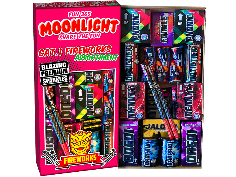 Moonlight nExtra groot pakket vol straatgenot, louter categorie 1 fun voor jong en oud! n nKruitgewicht 223 Gram nTube diameter – nBrandtijd – Seconden nHoogte – Moonlight Goedkoop vuurwerk kopen bij Vuurwerkwinkel Eindhoven