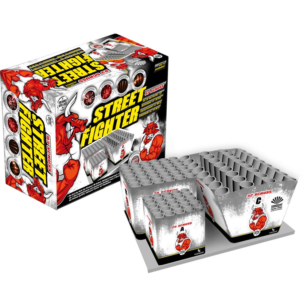 Streetfighter n nJe bent de held van de straat! 90 schoten compound-vuurwerk met meer dan 1 kilo explosieve massa en maximaal kaliber! Bijna 2 minuten is de lucht gevuld; inclusief waaier als finale. n nKaliber 30 nAantal schoten 93 nBrand duur 88 Seconden n