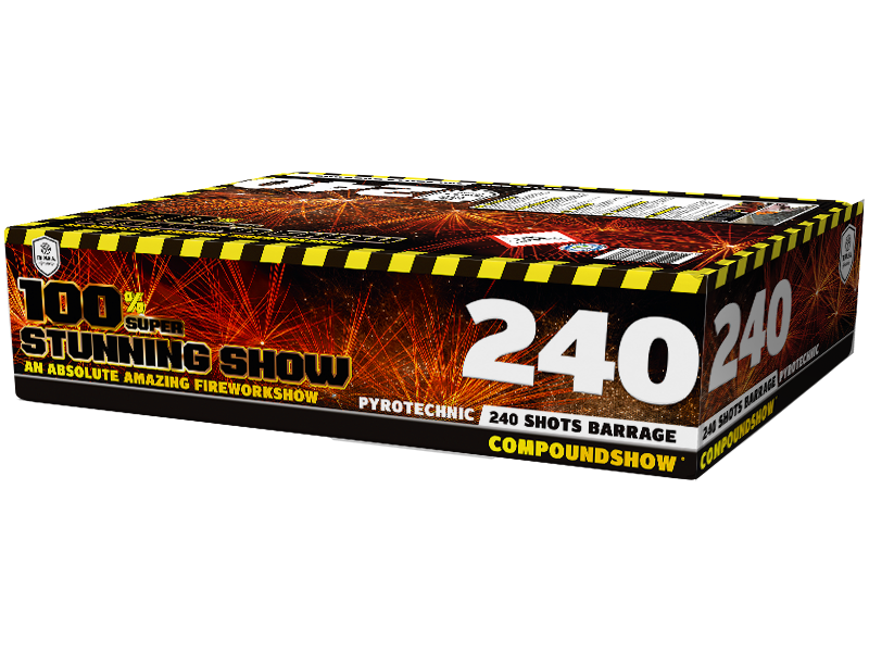 Stunning Show nWat een rambak! Maar liefst 240 schoten in een mooi tempo brengen je in 2 minuten in extase! n nKruitgewicht 1824 Gram nTube diameter 20 nBrandtijd 111 Seconden nHoogte 20 m. – 25 m. n