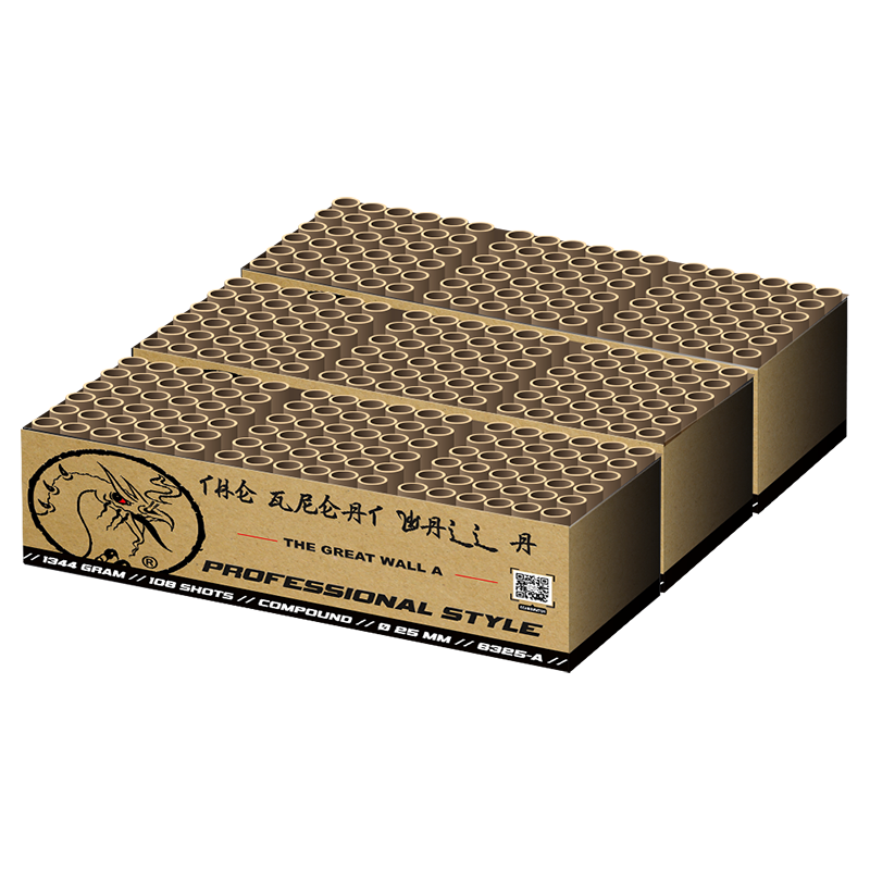 324 shots 25mm compoundset van Professional Style. The Great Wall is de internationale naam van de Chinese muur. En die is groot, net zoals deze super compoundset. Met drie compounds van ieder 108 schoten zet u een waar spektakel neer. Alleen de allermooiste effecten, in Professional Style, schieten in rap tempo, afgewisseld in salvos met een enorme passie de hemel in, nog niet te spreken over de rammende finale welke u buren fluitend buitenspel zet. Steek deze set volgens de afsteekvolgorde A, B, C aan, en uw show is fantastisch! n nProductinformatie: nType product: Siervuurwerk nEffect product: Compoundset nTube diameter: 25mm nFanshape: Nee nClassificatie: CAT.F2 nMinimale leeftijd: 16 jaar nLegaal afsteken op: 31 december nVeiligheidsafstand: minimaal 8 meter nGeschikt voor smalle straten: Ja nGeschikt in Gemeente vuurwerkverbod: Nee The Great Wall 324 shots 25mm Goedkoop vuurwerk kopen bij Vuurwerkwinkel Eindhoven