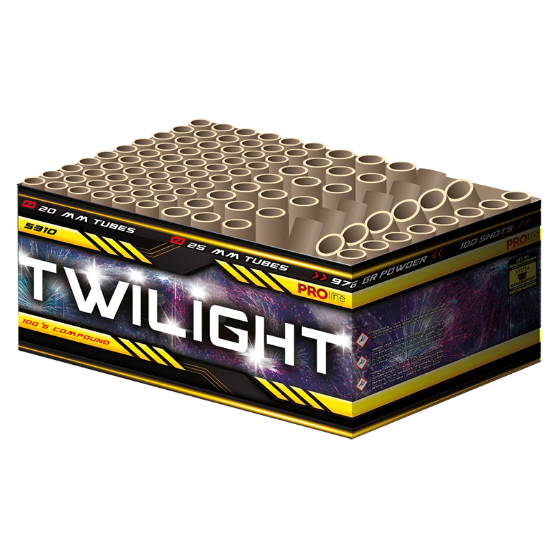Pro-line Fireworks Twilight, 100 shots, 20+25mm compound. Gekleurde peony met snow-style crackling, gouden salvos met ghost-effecten, fan/z-shape effecten en double gold en enkel goud effecten vormen een ultieme opbouw van begin tot eind. n nProductinformatie: nType product: Siervuurwerk nEffect product: Compound nTube diameter: 20+25mm nFanshape: Ja nClassificatie: CAT.F2 nMinimale leeftijd: 16 jaar nLegaal afsteken op: 31 december nVeiligheidsafstand: minimaal 8 meter nGeschikt voor smalle straten: Nee nGeschikt in Gemeente vuurwerkverbod: Nee Twilight 100 shots 20+25mm Goedkoop vuurwerk kopen bij Vuurwerkwinkel Eindhoven